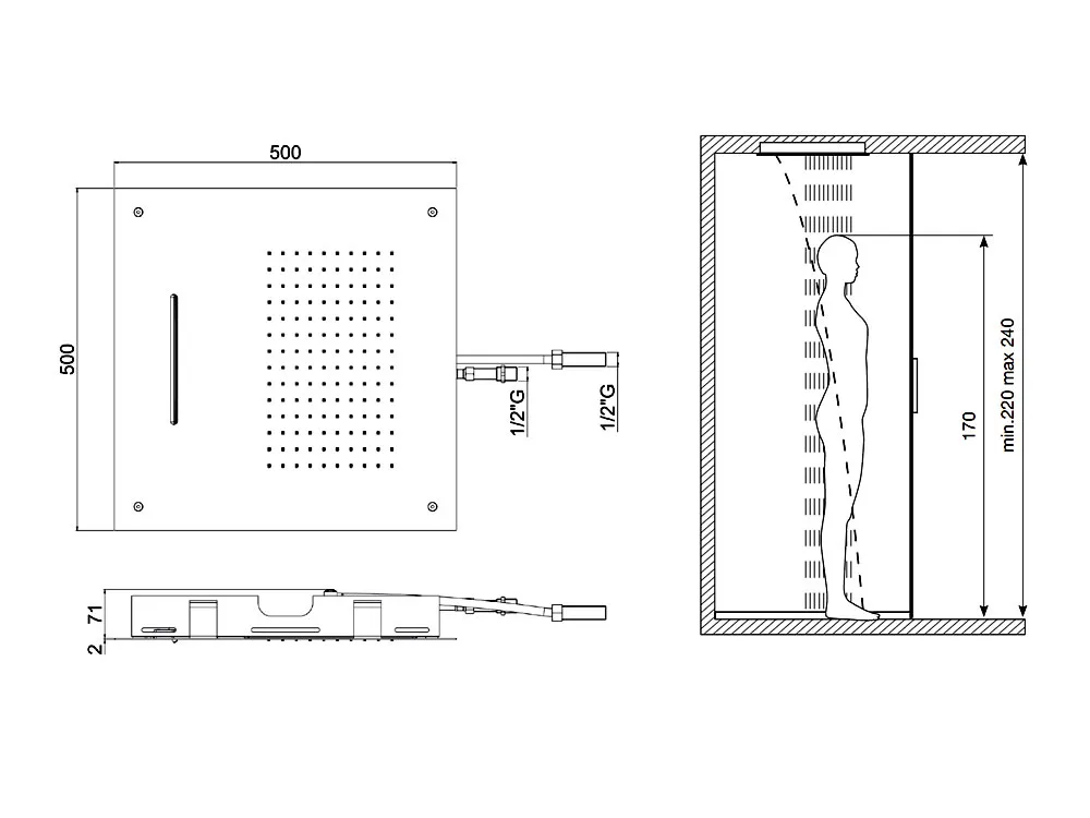 Εντοιχιζόμενη Κεφαλή ντουζ τετράγωνης διατομής Almar E044109-111 50 x 50 cm Inox Matt. Κατασκευή από Ανοξείδωτο Χάλυβα με 2 Λειτουργίες ροής.