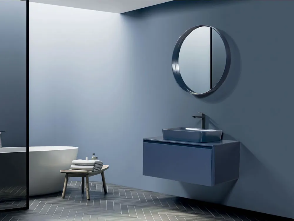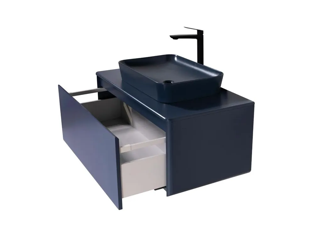 Έπιπλο μπάνιου Curved 100 cm με επιτραπέζιο νιπτήρα πορσελάνης 60 x 40 cm. Υλικό κατασκευής Κόντρα Πλακέ Θαλάσσης με επικάλυψη Ματ Λάκας.