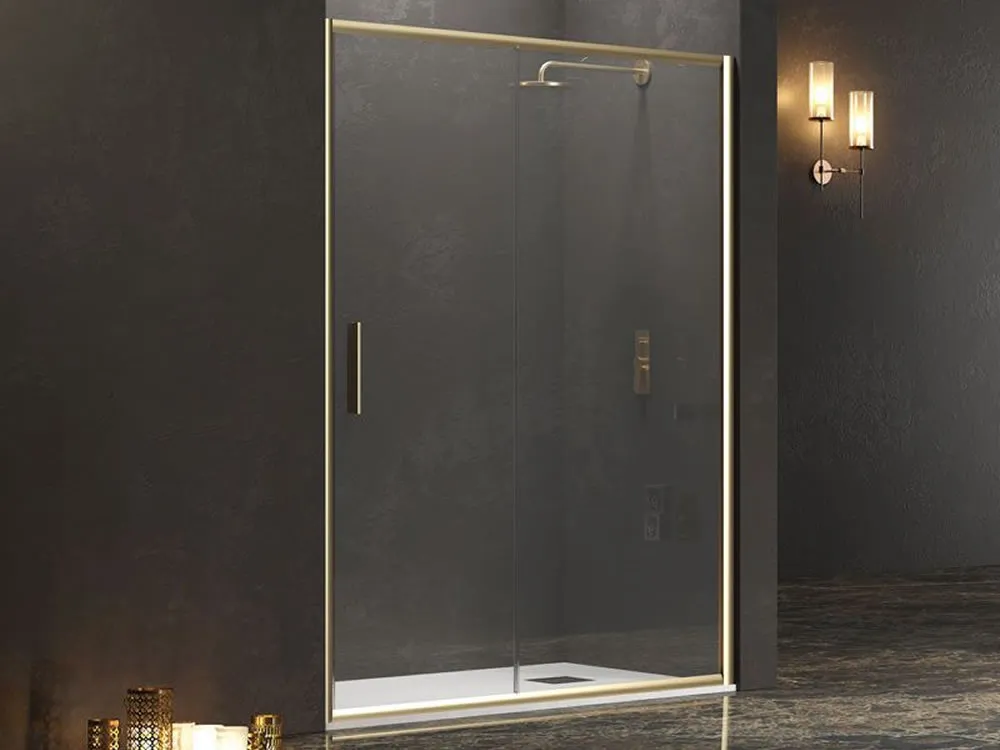 Καμπίνα ντουζιέρας από Τοίχο σε Τοίχο με Διαφανές Κρύσταλλο ασφαλείας Efe 400 CL Gold Matt 150 cm. Με 1 Συρόμενο και 1 Σταθερό φύλλο.