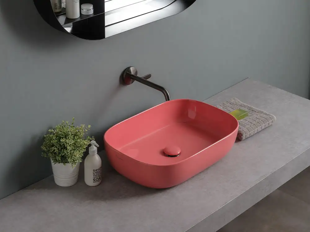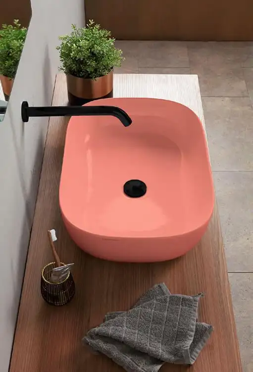 Επιτραπέζιος νιπτήρας μπάνιου Glam Glossy Peach 1804-820 56x39cm, χωρίς υπερχείλιση. Συνδυάζεται με επιτραπέζιες η επίτοιχες μπαταρίες νιπτήρα.