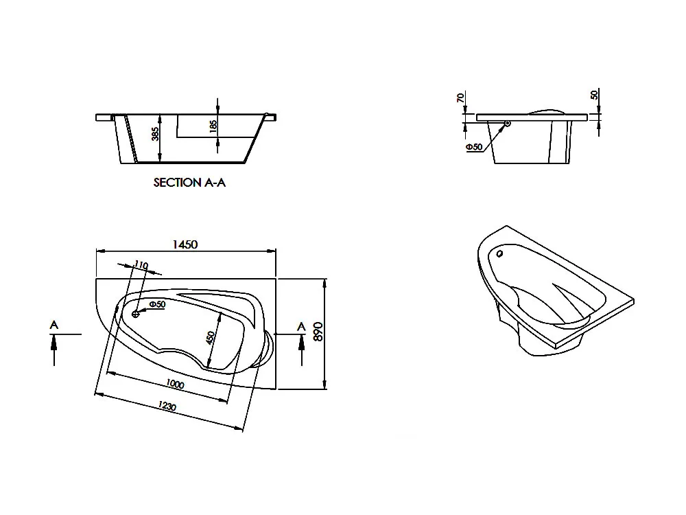 Μπανιέρα Γωνιακή Kochili Δεξιά 145 x 90 cm. Κατασκευασμένη από Ακρυλικό φύλλο Asterite Lucite διατίθεται και με σύστημα Υδρομασάζ.