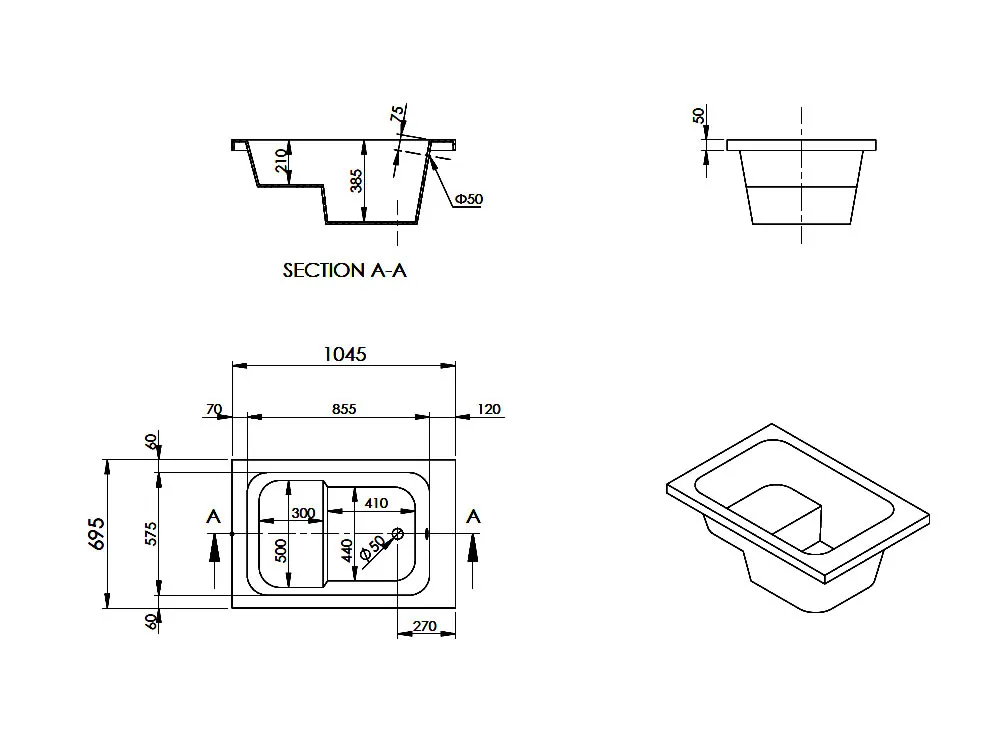 Μπανιέρα ευθύγραμμη Kymi 105 x 70 cm. Κατασκευασμένη από Ακρυλικό φύλλο Asterite Lucite δεν διατίθεται και με σύστημα Υδρομασάζ.