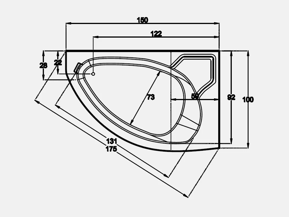 Μπανιέρα Ασύμμετρη γωνιακής τοποθέτησης Lydia 150 x 100 cm για Δεξιά γωνία. Κατασκευασμένη από Ακρυλικό φύλλο Lucite SW.