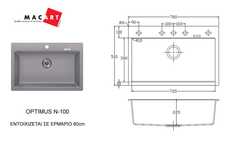 Νεροχύτης Κουζίνας Macart Optimus N-100 78 x 51 cm σε απόχρωση Alaska. Κατασκευή από υλικό Silgranit Puradur με αντοχή στα χτυπήματα.