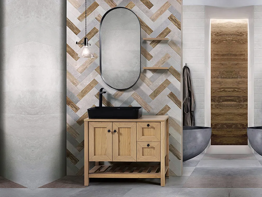 Έπιπλο μπάνιου Nefeli 100 cm με επιτραπέζιο νιπτήρα Πορσελάνης 60 x 40 cm. Υλικό κατασκευής Κόντρα Πλακέ Θαλάσσης με επικάλυψη Καπλαμά.