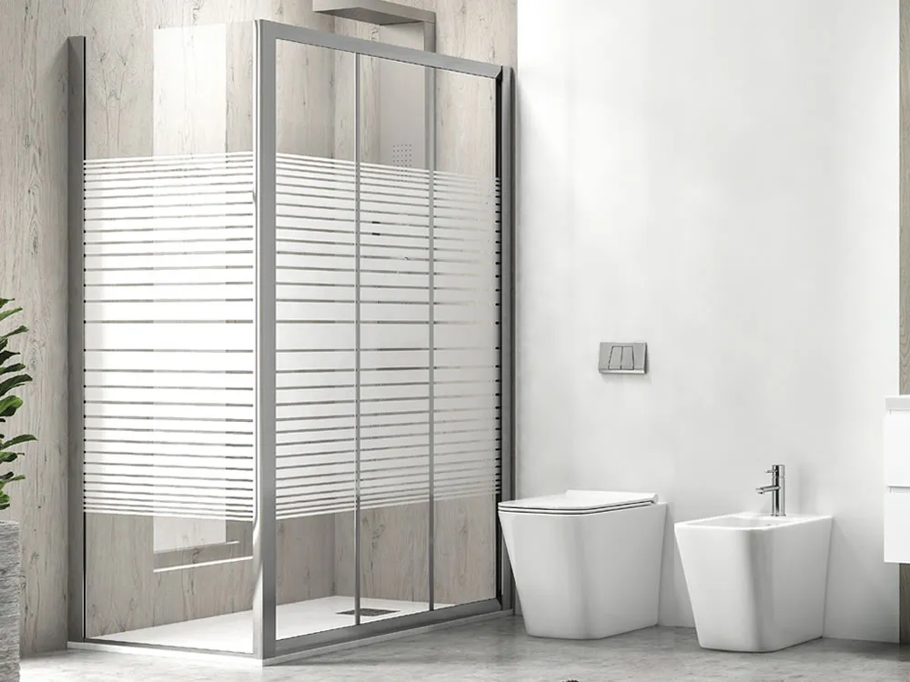 Ορθογώνια καμπίνα ντουζιέρας με κρύσταλλο Σεριγραφάτο ασφαλείας Penta 300 REC LN 150 x 70 cm με 2 Συρόμενες Πόρτες και 1 πλαινό σταθερό φύλλο.