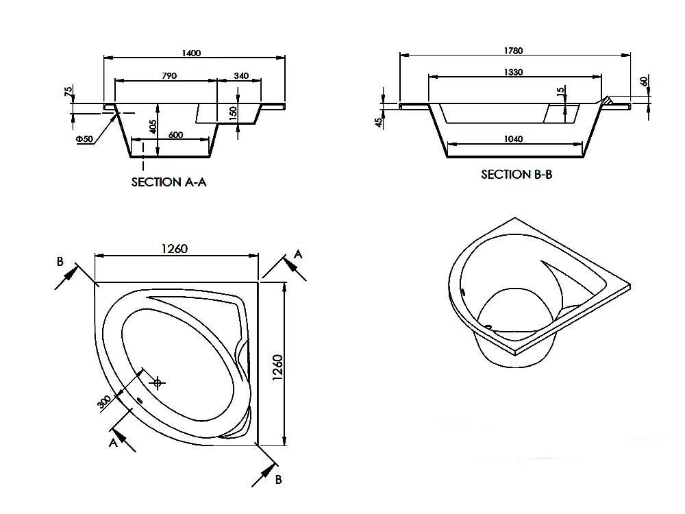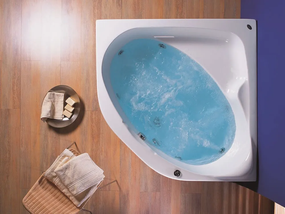 Μπανιέρα Γωνιακή Santorini 127 x 127 cm. Κατασκευασμένη από Ακρυλικό φύλλο Asterite Lucite διατίθεται και με σύστημα Υδρομασάζ.