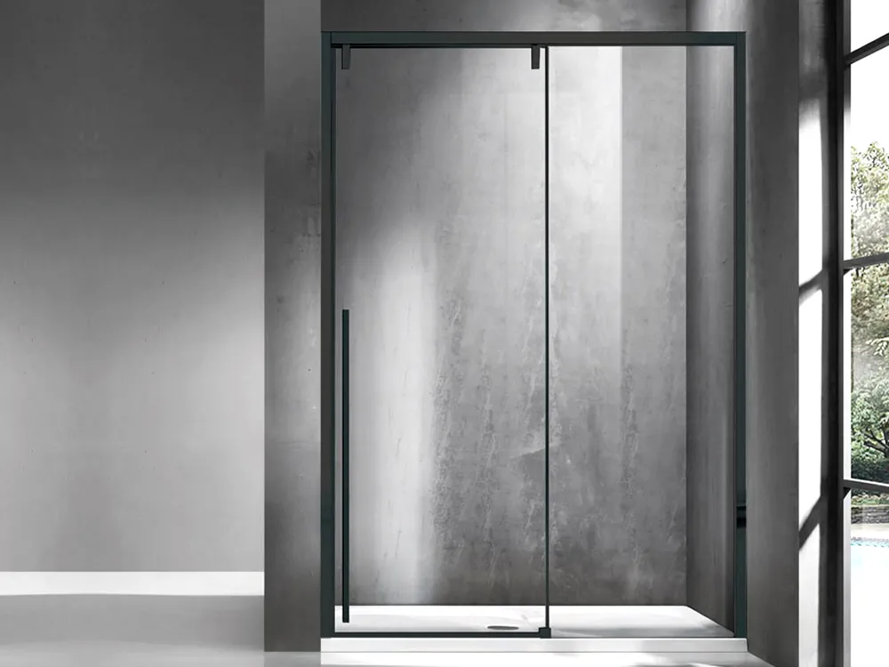 Καμπίνα ντουζιέρας από Τοίχο σε Τοίχο με Διαφανές Κρύσταλλο ασφαλείας Santorini 400 CL Black Matt 120 cm. Με 1 Συρόμενο και 1 Σταθερό φύλλο.